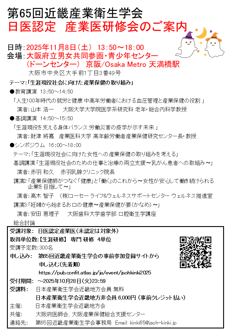 2025.10.14 ▶第65回近畿産業衛生学会日医認定産業医研修会のご案内 [関係機関行事]